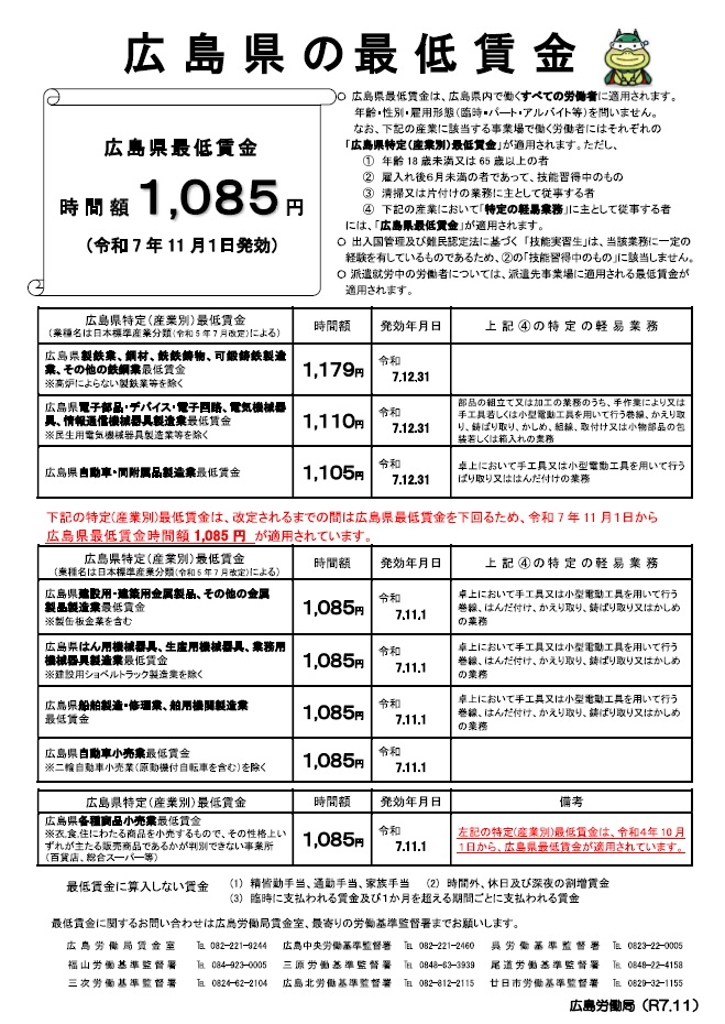 令和7年11月1日より、産業別の最低賃金が改正されます。