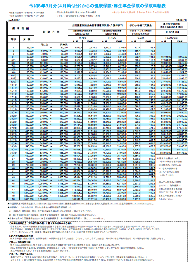 注※↓広島県の健康保険料の表になります |